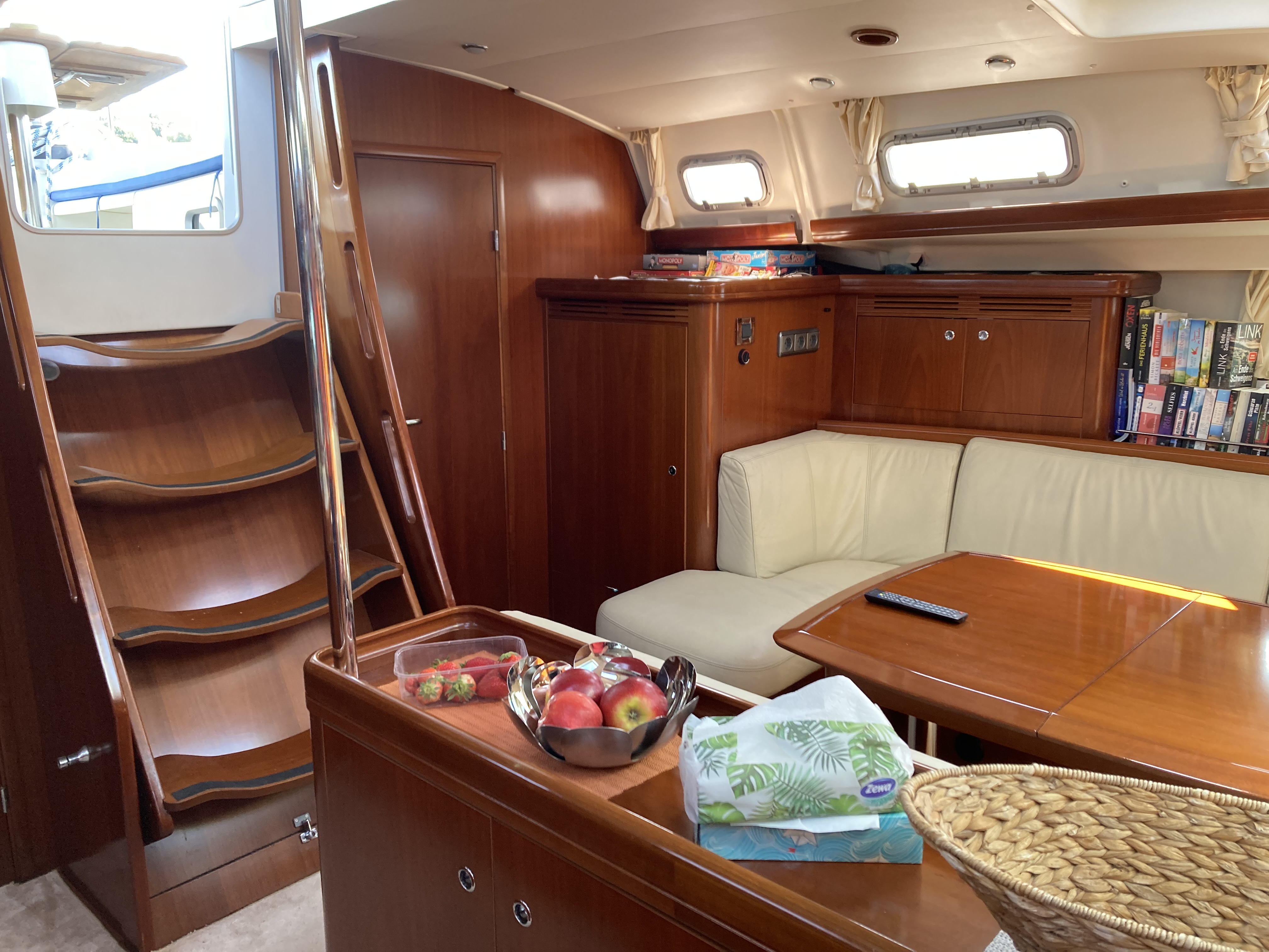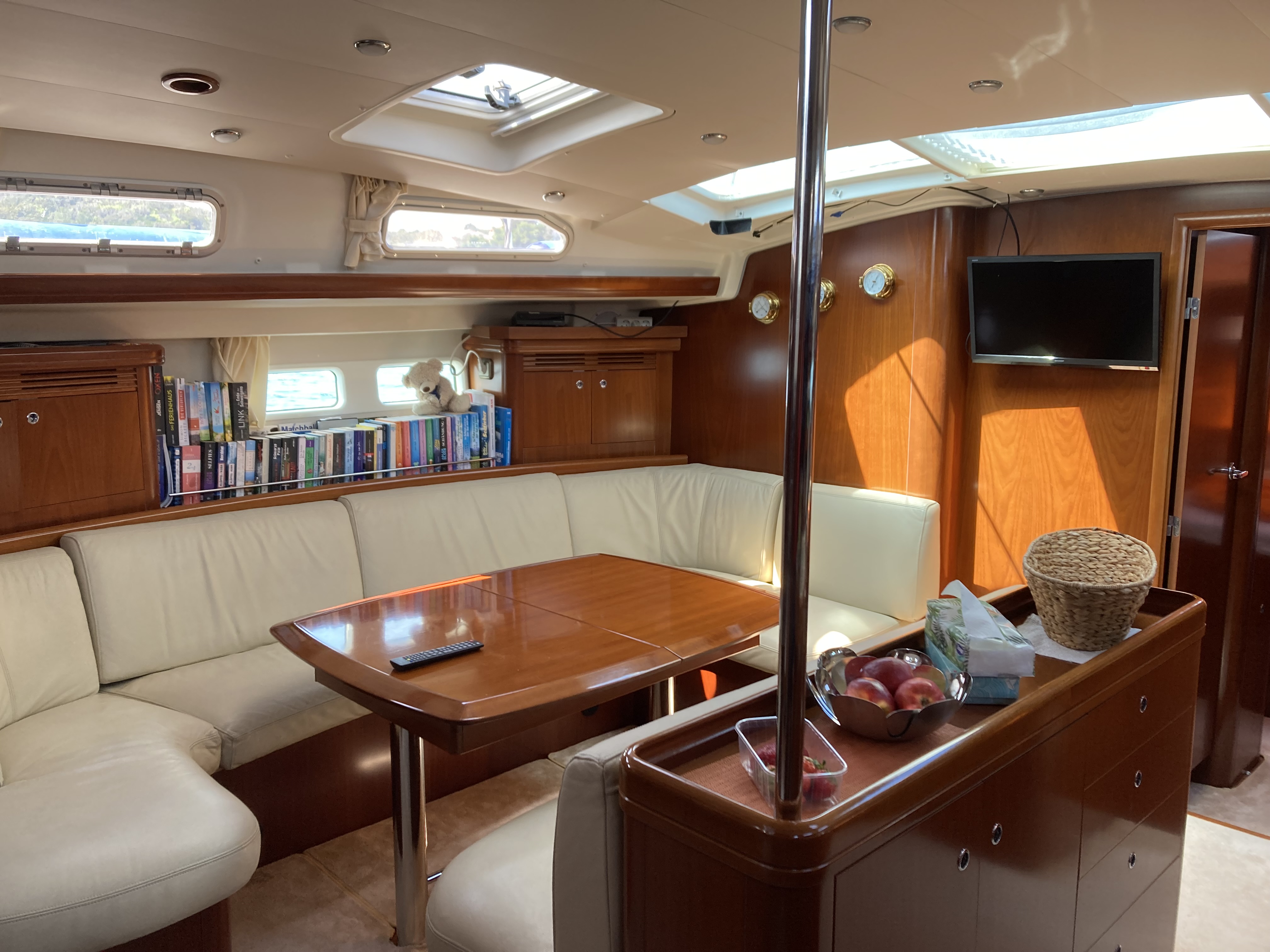 Der geräumige Salon verfügt über einen große Sitzgarnitur. Die kleine bordeigene Bibliothek steht den Gästen ebenso zur Verfügung. Die Yacht ist mit TV und W-LAN ausgestattet. Einen 230 Volt Versorgung ist an Bord ebenfalls vorhanden.